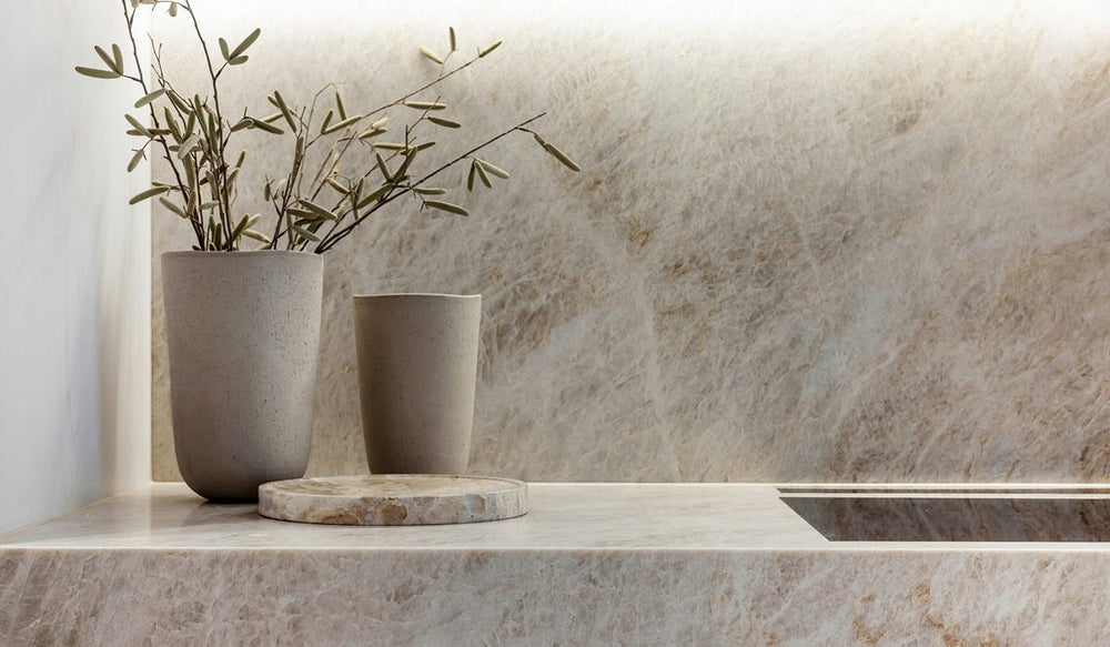 Bathrooms: as feature walls, vanities, or large-format floor tiles for a seamless spa-like effect.